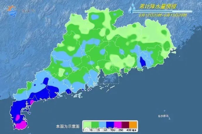 6月13日-15日,广东省将出现入汛以来最强的降水过程,大部分市县先后有暴雨到大暴雨,局部特大暴雨(面上累积雨量80-120毫米,局地最大400-450毫米),主要降水时段为13日-14日。
