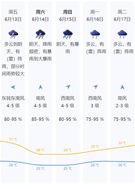 受副热带高压以及台风外围环流共同影响,深圳高温天气将缓解,而风雨影响会逐渐明显,特别是6月13-15日,受台风环流影响,暴雨风险高、风力大,深圳主要影响是降雨,周末有出行计划的小伙伴要时刻关注天气预报。