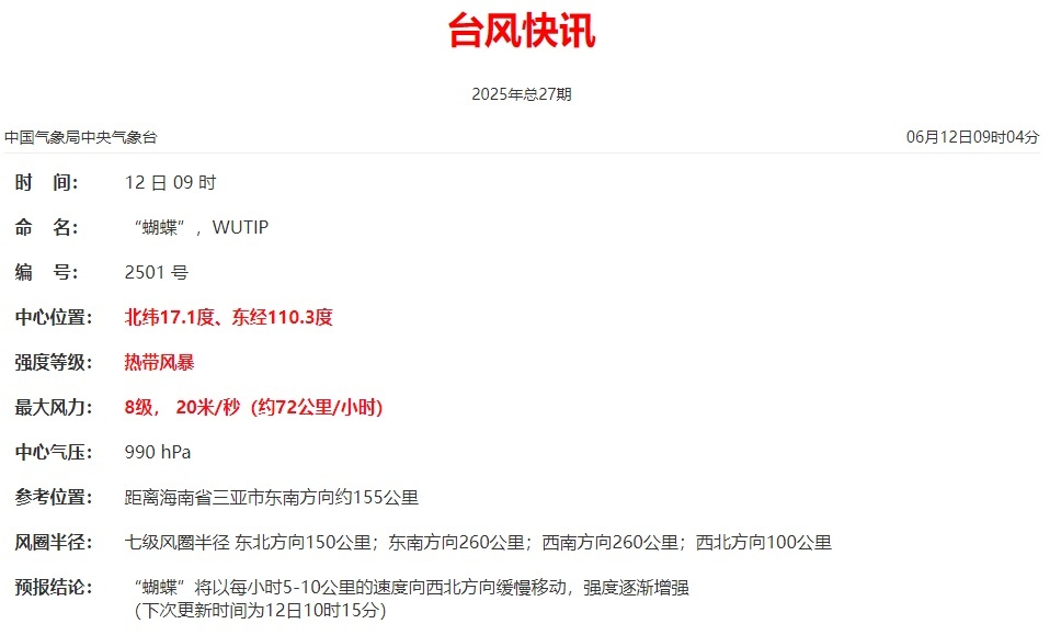 6月12日9时,台风“蝴蝶”中心距离海南省三亚市东南方向约155公里,也就是北纬17.1度、东经110.3度,中心附近最大风力8级(20米/秒),中心最低气压990百帕。